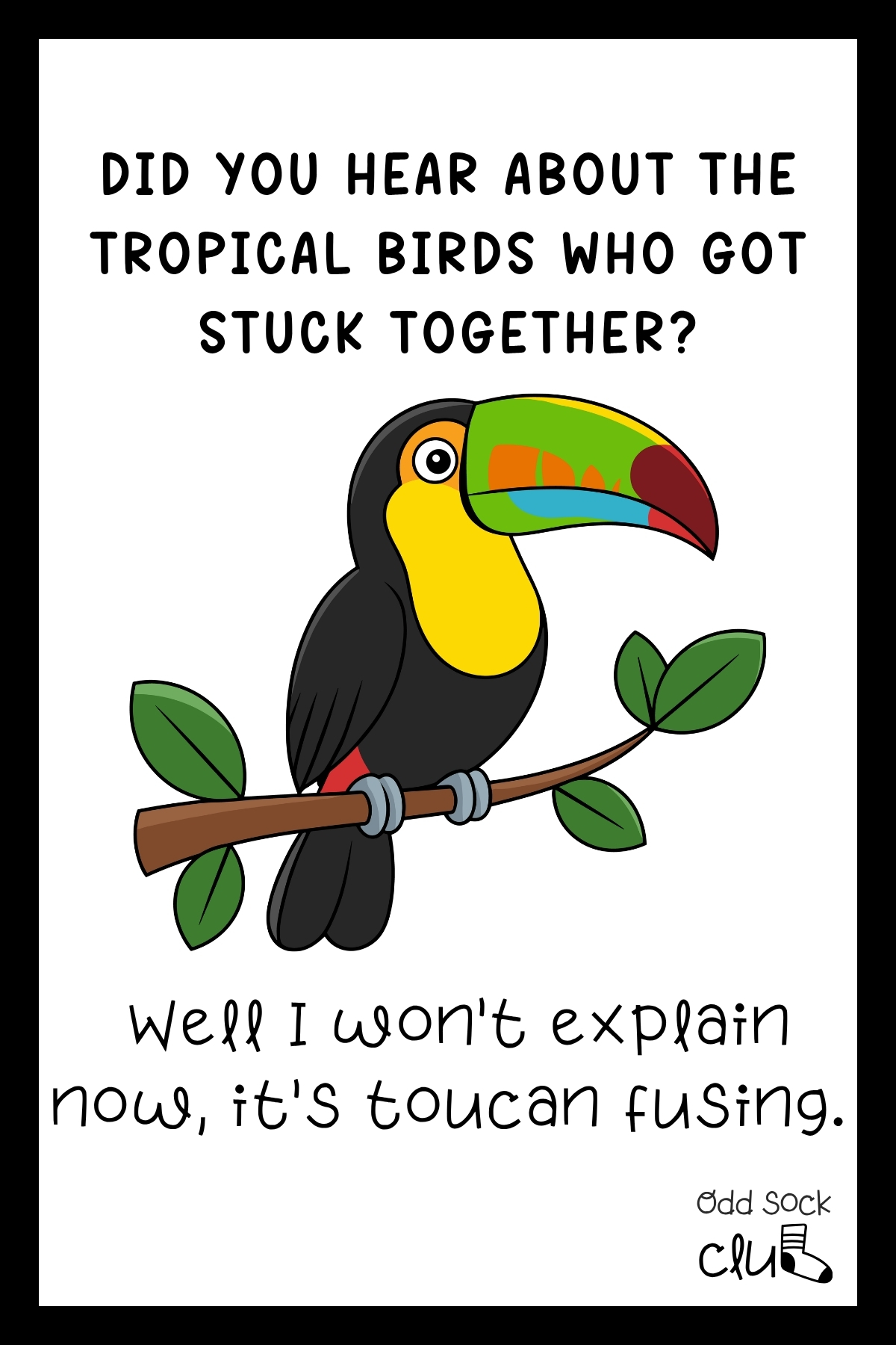 - Did you hear about the tropical birds who got stuck together? Well I won’t explain now, it’s toucan fusing.